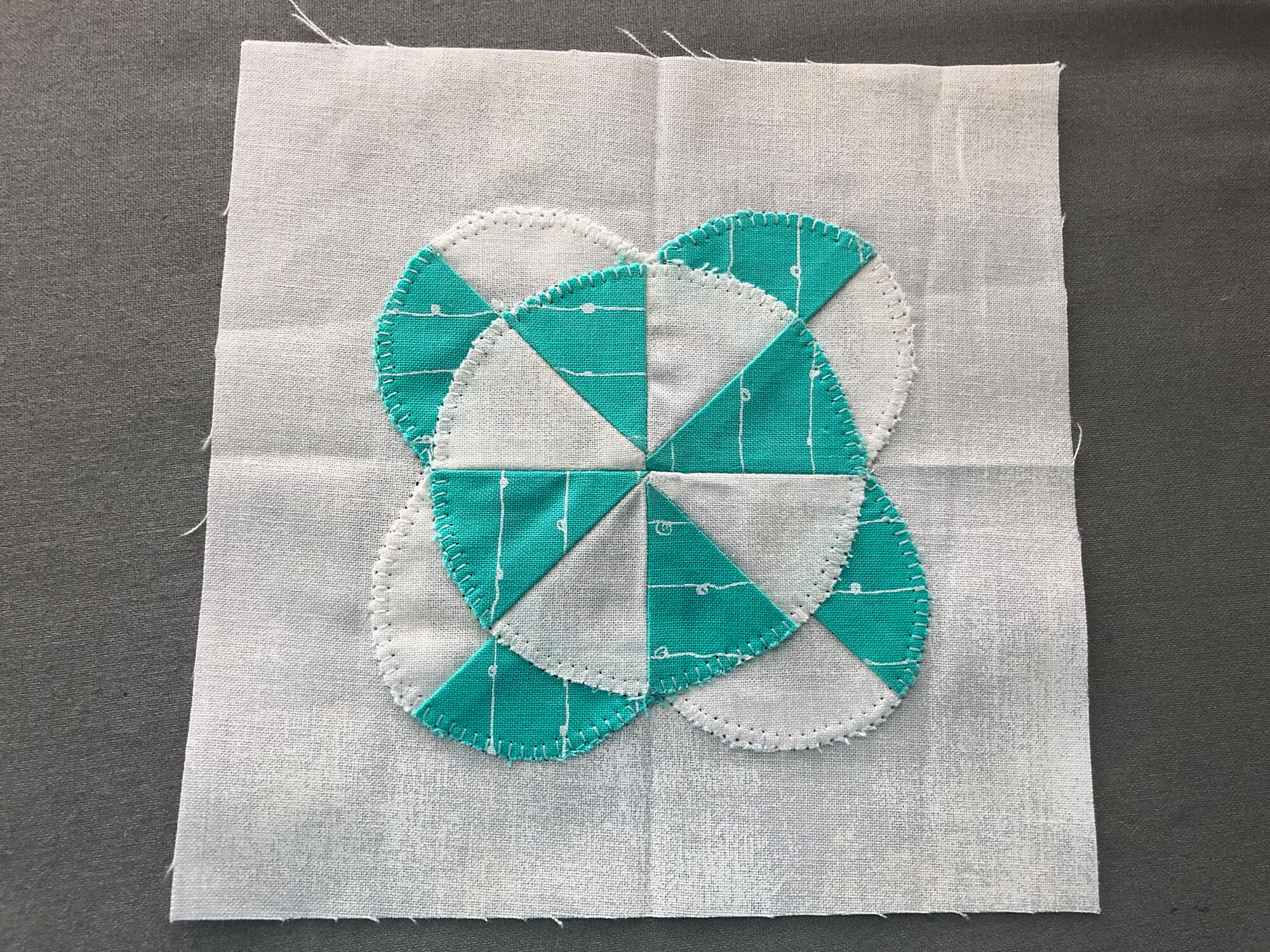 Next I appliquéd the center circle and then the background corners. Circle went fine but when I appliquéd the corners to create the outer corner affect, I was disappointed in how the foreground colors peaked through. As you can see, it totally ruined the look of the block. Note to self: don’t appliqué background to foreground when you truly want it to be background. Oops. However, it might work with needle-turn appliqué if you are able to trim away the back layer afterwords.